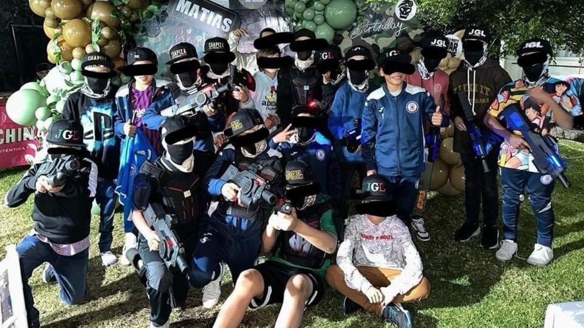 En fotos de la fiesta organizada por el «Catá»los niños llevan gorras con las iniciales JGL, las del narcotraficante Joaquín Guzmán Loerapadre de ovidio, preso en Estados Unidos. Otros niños llevan gorras que dicen Capítuloalgunos con los uniformes Cruz Azul.