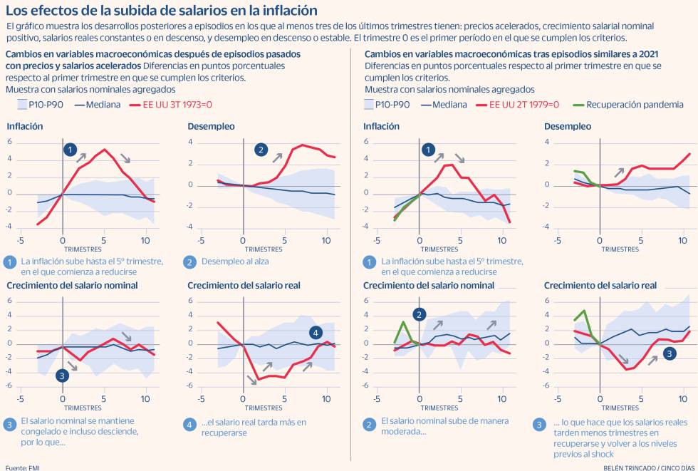 La teoría económica clásica indica que sufrir salarios en tiempos de inflación es como gasolina tiene un fuego. No obstante, un grupo de economistas del FMI indica en un destinatario de la información que el incremento salarial puede ser completamente neutral. En la publicación se analizan los periodos históricos en las posibles observaciones de espirales precio-salario. La institución que encabeza Kristalina Georgieva concluyó que el aumento moderado de empleados nominales [por debajo de los niveles de IPC] «no necesariamente debe ser visto como un síntoma de una espiral precio-salario».